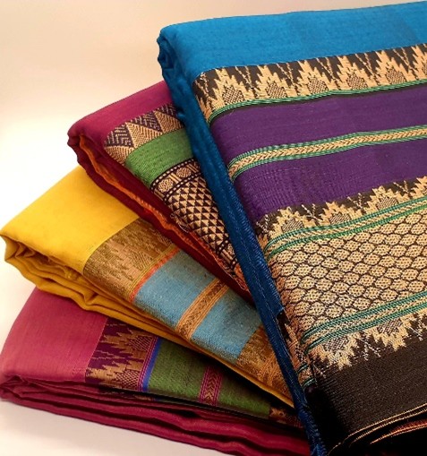 - Contrast Borders: They typically have broad, solid-coloured borders achieved through the Korvai weaving technique, where the border and body are woven separately and then joined.